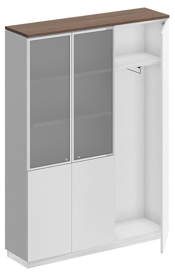 Шкаф состоит из шкафа для документов со стеклом, узкого шкафа для одежды под общим топом и цоколя на 2 шкафа.