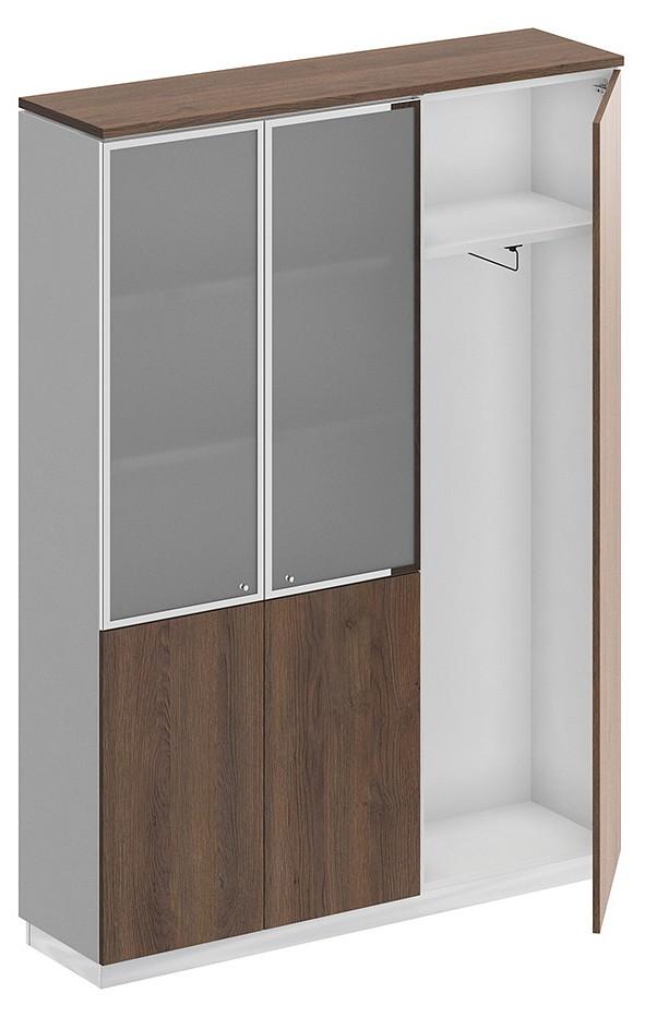 Шкаф состоит из шкафа для документов со стеклом, узкого шкафа для одежды под общим топом и цоколя на 2 шкафа.