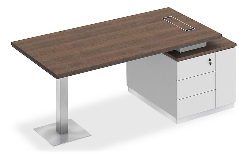 Стол состоит из столешницы, заглушки кабель-канала, металлической опоры и опорной тумбы.