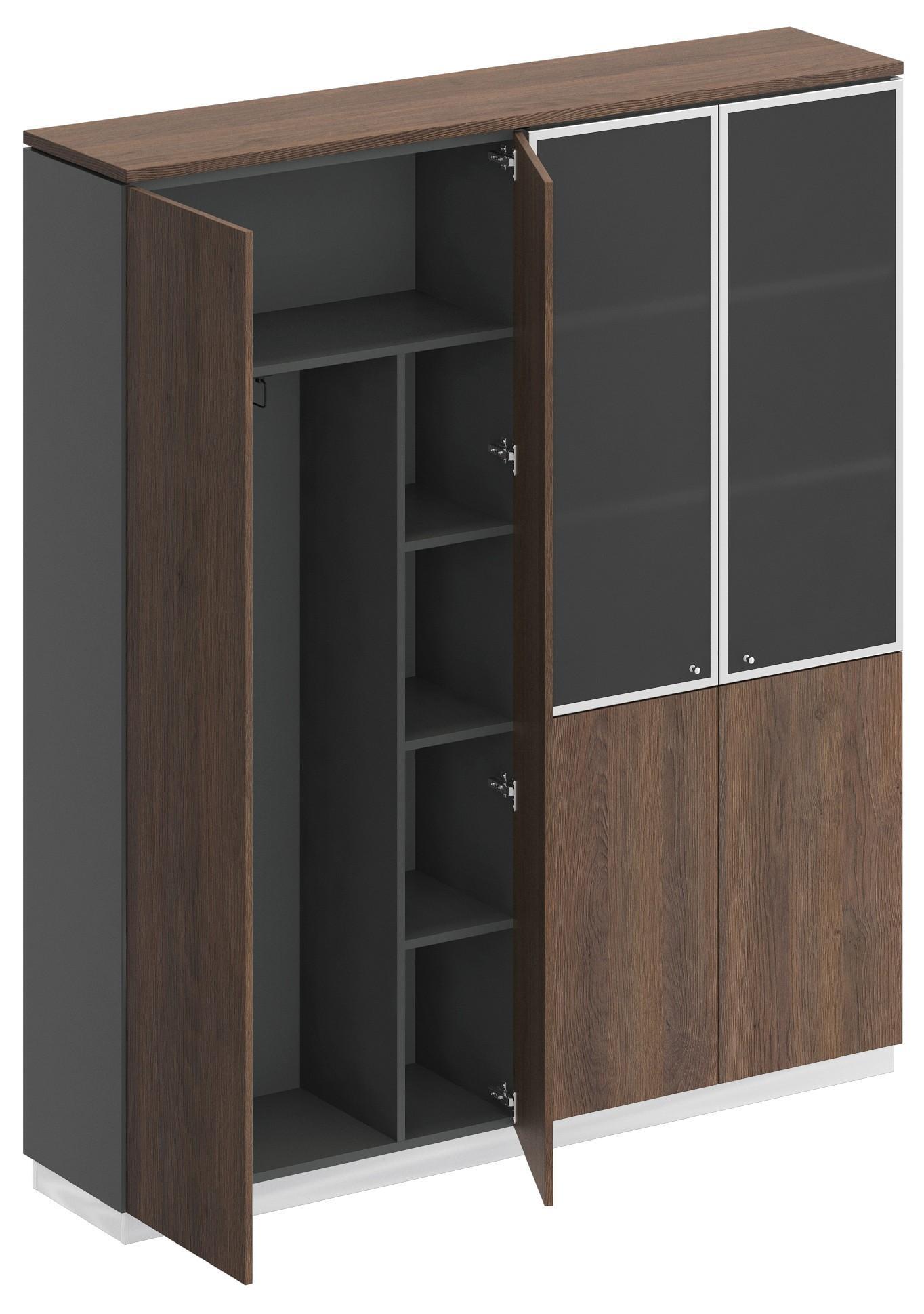 Шкаф состоит из шкафа для документов со стеклом и шкафа для одежды с дополнением под общим топом, цоколя на 2 шкафа и дверей.