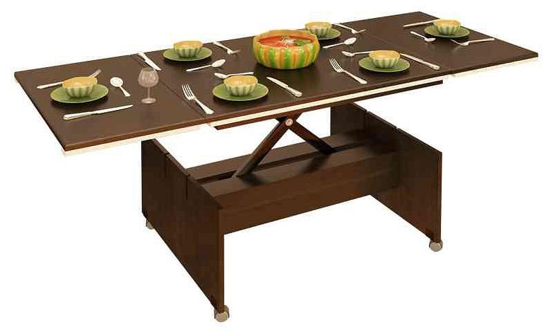 Интересный стол-трансформер-3 имеет целых несколько положений высоты, что позволяет использовать его в различных ситуациях — от тихого семейного вечера до приема гостей. Механизм поднимается ступенчато с шагом в 50 мм. Также модель имеет возможность увеличения полезной площади стола за счет простого механизма раскладывания.