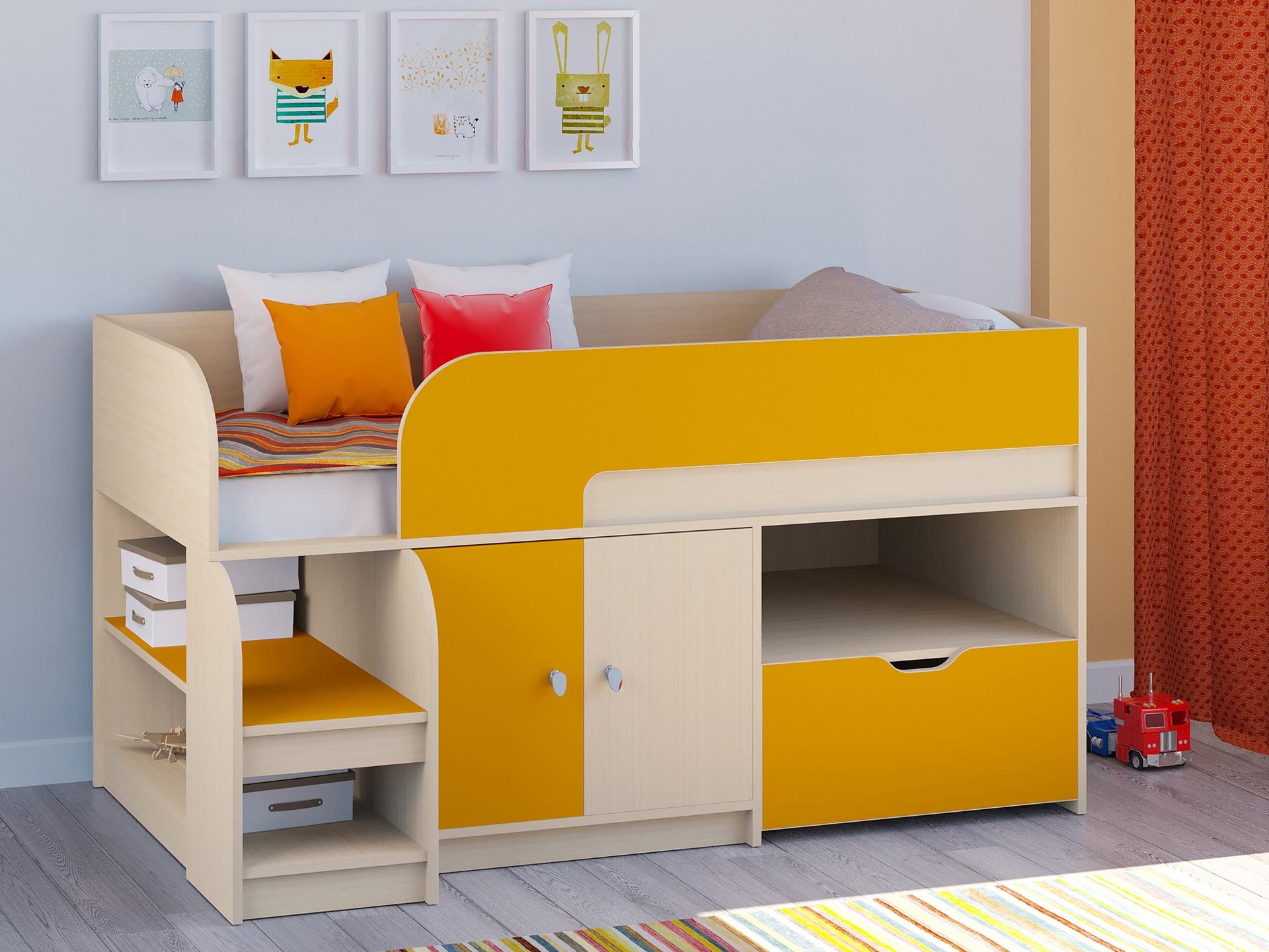 Ваш ребенок вырос и наступила пора обновить мебель в детской? Набор для детской Астра 9/4 RVM_ASTRA9-V4-1-4 – отличное решение, которое понравится не только вам, но и будущему маленькому хозяину или хозяйке. Изделие выпущено известным брендом РВ-Мебель (Россия) и входит в коллекцию «Астра 9/4». Эффектный матовый корпус оттенка дуб молочный, оранжевый смотрится изысканно и изящно, гармонично дополняя фасад, изготовленный из практичного и востребованного для детской материала (ЛДСП Е1). Перед приобретением новой кровати не забудьте тщательно замерить свободную площадь в комнате, чтобы кровать точно подошла по габаритам (900 мм в высоту, 1632 мм в ширину и (уточните актуальную информацию у нашего консультанта) мм в длину), а также подобрать матрас 1600x800 мм. В комплект входит основание настил из ЛДСП,