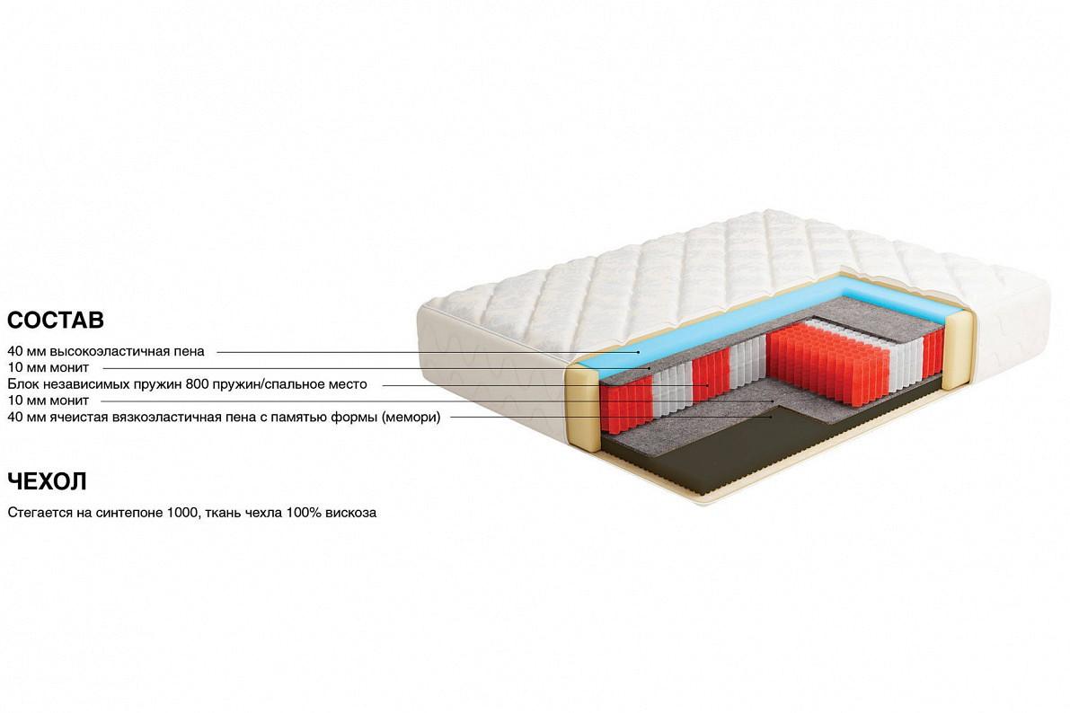 Матрас сочетает в себе внешнюю красоту чехла, который делается из премиальных тканей из 100% вискозы, и высочайший комфорт, который обеспечивают независимый блок пружин и высокотехнологичные ортопедические пены. Благодаря такому количеству пружин матрас может выдержать достаточно высокие нагрузки, а также точнее подстраиваться под форму спящего. На этом матрасе себя будут комфортно чувствовать пары с большей разницей в весе, эффекта «скатывания» не будет.