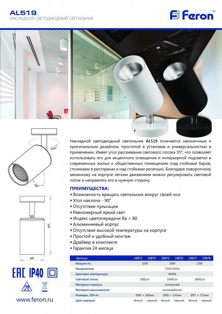 Светильник накладной светодиодный для акцентного освещения, спот поворотный (ДПО) FERON AL519, 23 W, (белый), 230V, 1840Lm, IP40, угол рассеивания 35°, цвет черный, корпус алюминий, рассеиватель поликарбонат, 97*97*213